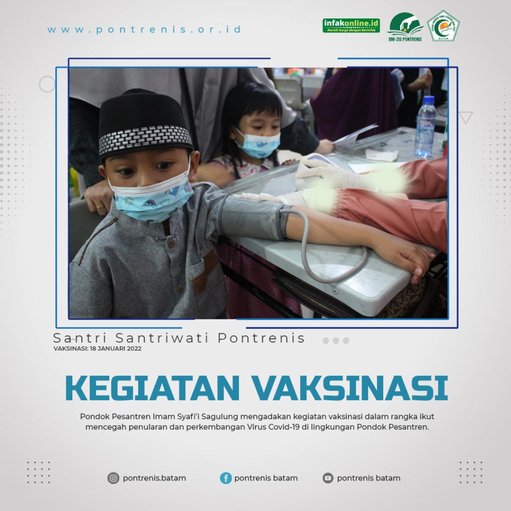 Dalam rangka pencegahan penularan dan perkembangan Virus Covid-19, Pondok Pesantren Imam Syafi’i (Pontrenis) Batam mengadakan kegiatan vaksinasi yang alhamdulillah pada kesempatan ini juga dibantu oleh pihak luar seperti Dinas Kesehatan Kota Batam, Kepolisian Republik Indonesia (Polri) Kota Batam, dan juga perangkat-perangkat desa terkait yang ikut membantu dalam mensukseskan acara vaksinasi pada Selasa, 18 Januari 2022.